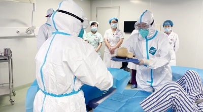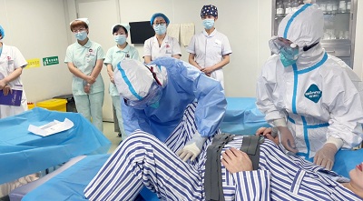 此次应急演练模拟一位孕38周孕产妇,孕期发现感染艾滋病,未规律服用抗病毒药物,现已临产并急诊入院为背景开展。主要情节是:临产妇在传染病标准防护下转入“隔离手术间”准备引产。妇产科医生接到通知后迅速穿戴好隔离防护服、佩戴好防护口罩及护目镜对临产妇进行了综合评估和助产。产科值班医生对临产妇进行了询问并让其签署了艾滋病阳性孕产妇结果告知书,随后助产士对临产妇的宫口情况进行了检查,发现其宫口已开8公分,胎儿即将分娩。在医护人员的全力配合和共同努力下,最终新生儿顺利娩出,随后对新生儿进行了口鼻清洗及规范的抗病毒治疗。